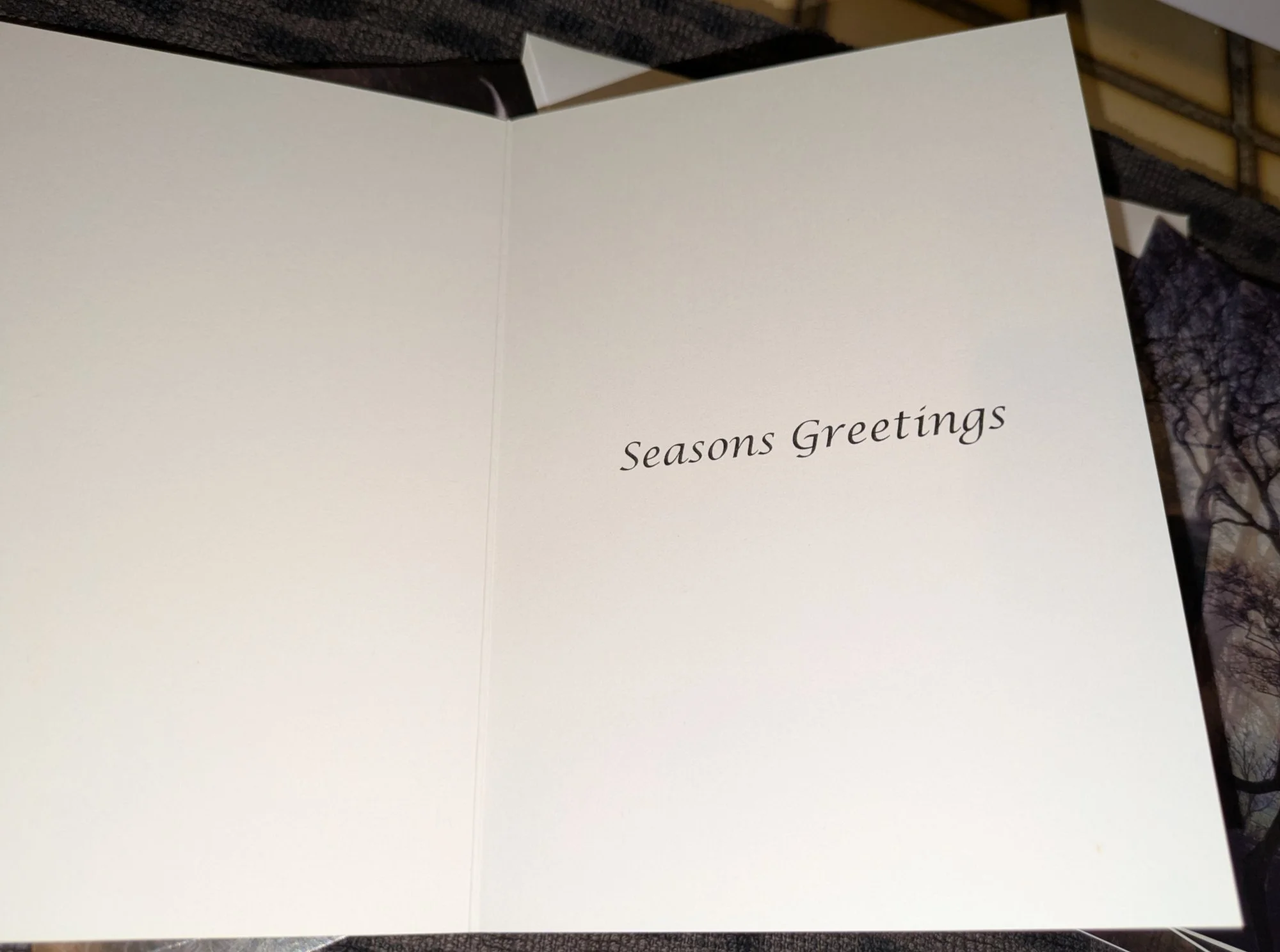 The cards have various greetings such as “Season’s Greetings” and “Merry Christmas”.